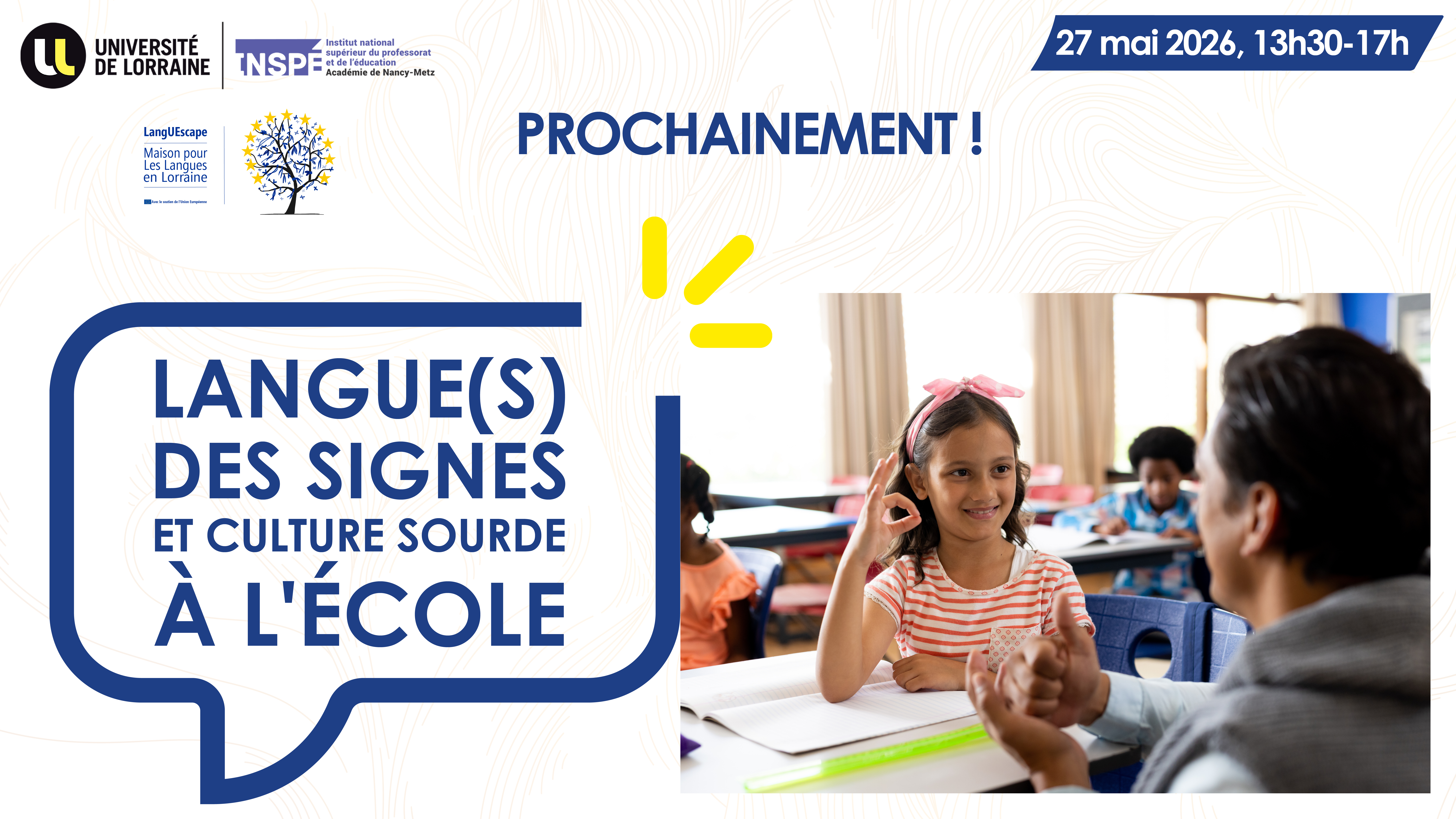Bienvenue sur le formulaire d’inscription à la Journée d'études - INSPÉ de Lorraine - Langue(s) des signes, Culture sourde et Ecole qui se tiendra le mercredi 27 mai 2026, de 13h30 à 17h00, sur le campus Nancy-Maxéville de l'INSPÉ de Lorraine.